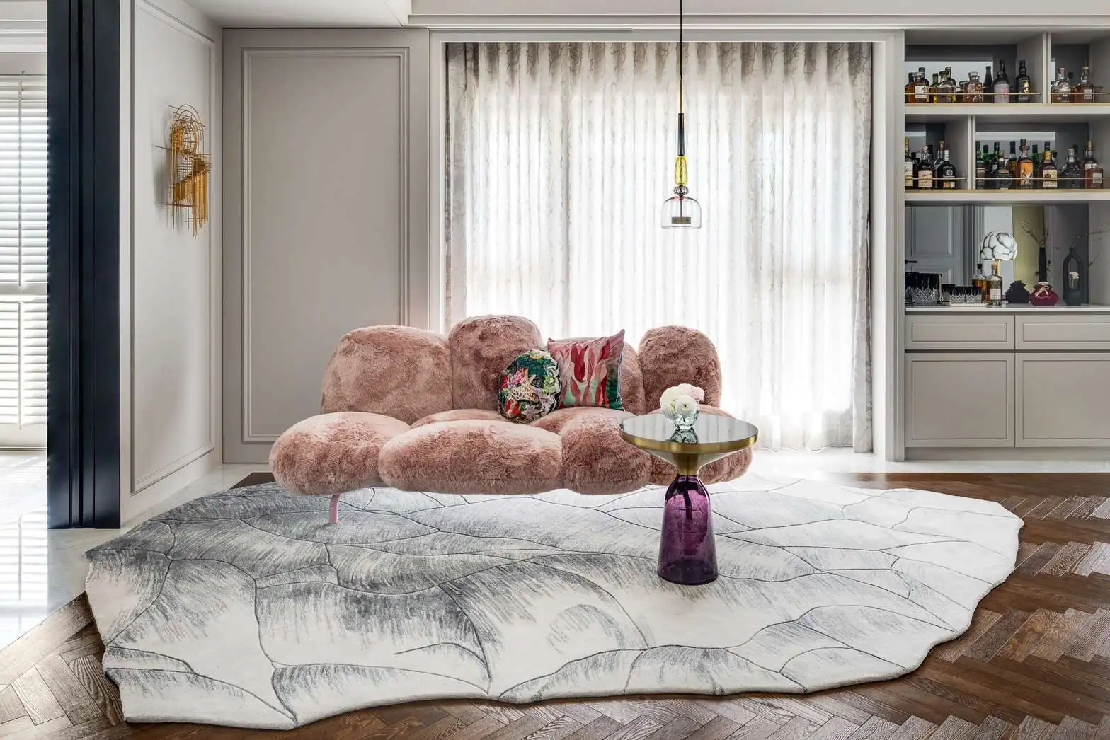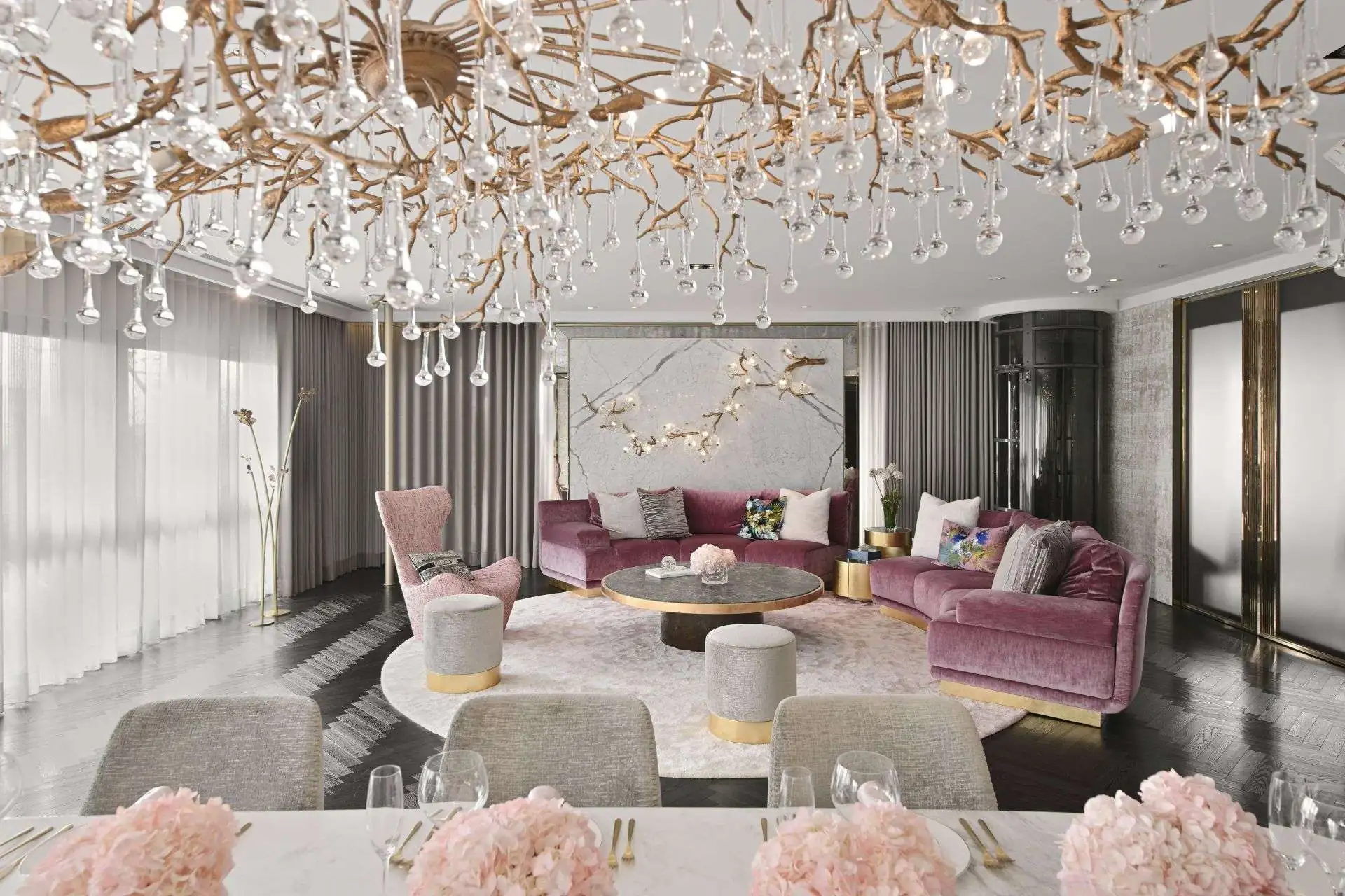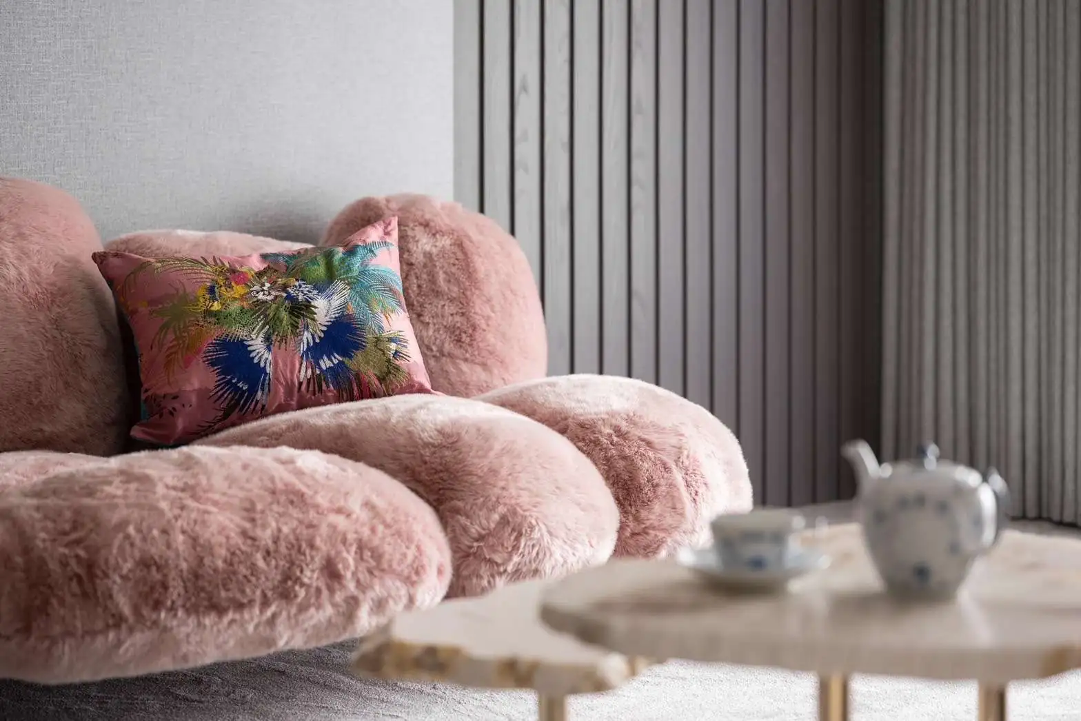 粉色風格搭配樹枝狀燈飾創造空間層次感江欣宜表示除了聲音與香氛及光線,可以讓氛圍有不一樣的感受性之外,材質的運用是最能夠快速變換空間中的氛圍。她分享,曾經在羅馬的一家酒店迎賓處,看到一張毛茸茸的粉色單椅,迅速被抓住眼球。無法想像再擁有上百年歷史的羅馬的某家酒店中,在大廳,陳列了一張具有現代感一切元素的單椅,還是以粉紅色呈現。江欣宜表示她一看到這張毛茸茸的粉色單椅,她就愛上了,而後開始找尋品牌資訊,設計師是誰等等的,宛如看到神秘而又時髦的低調品牌服裝秀。