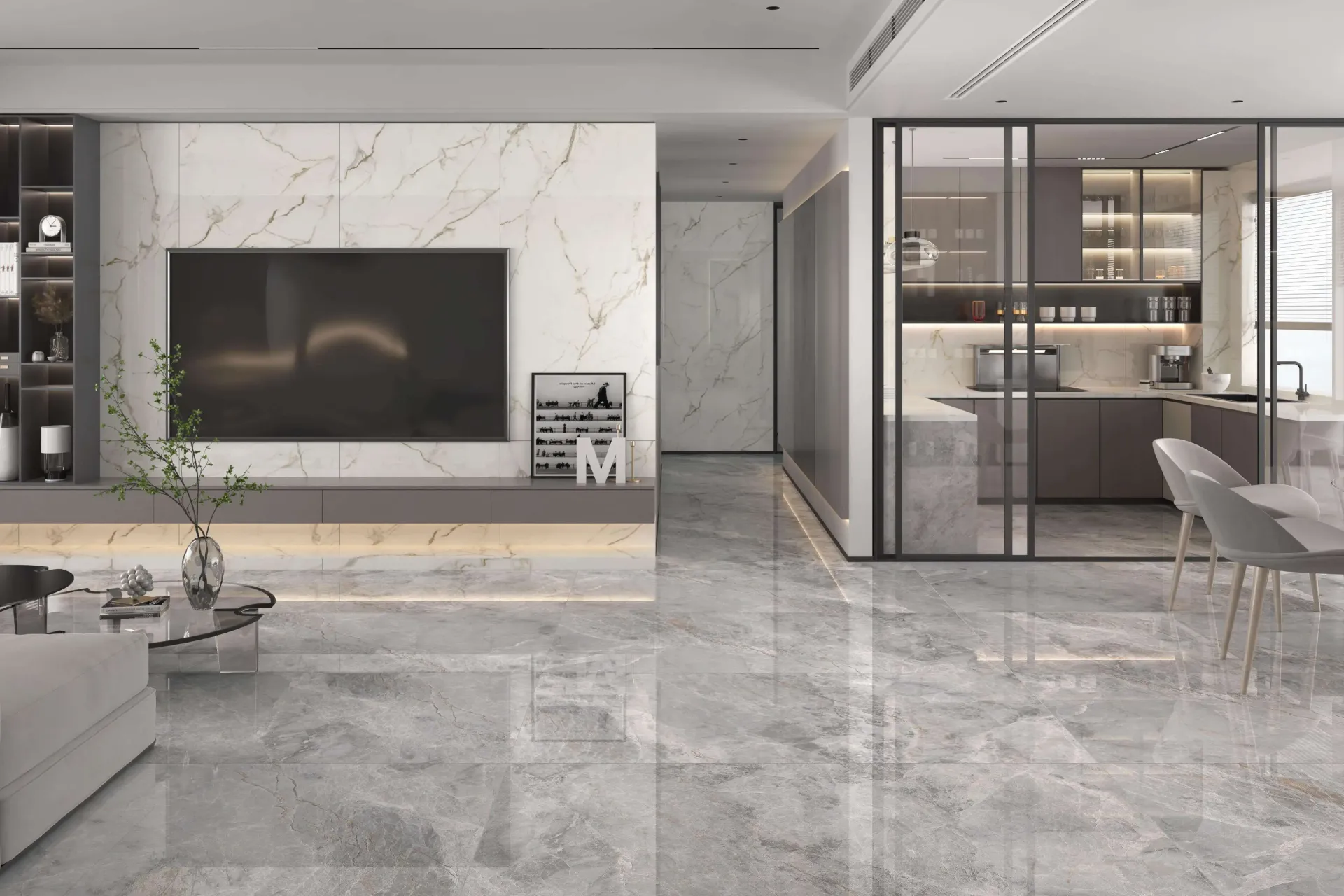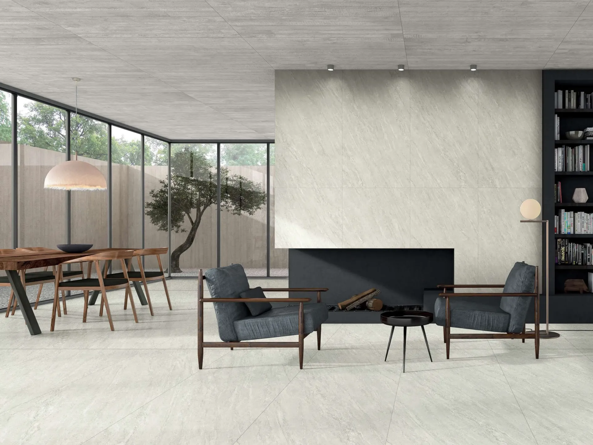 幻影石-暖淺灰_客餐廳。圖片來源/冠軍建材。冠軍表示,旗下「瓷藝中板(MASTER ART)」具備三大市場拓展特點,包括在產品售價上,相較於高價位的義大利、西班牙進口磁磚,具貼近國產市場高性價比優勢,相當於天然石材1/3價格、歐洲進口磁磚7.5折的合宜訂價。