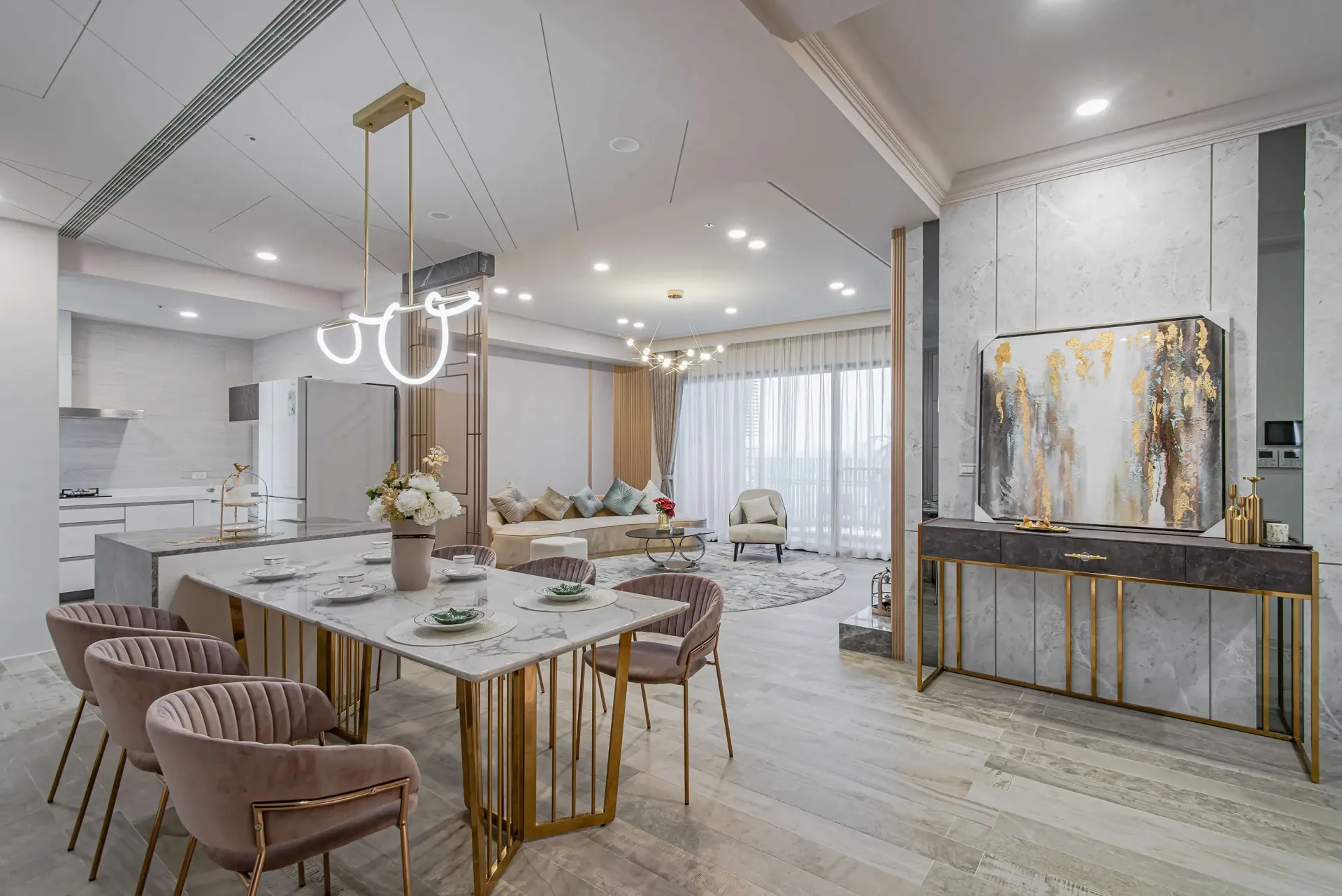 黃子溱 2022 MUSE Design Award 銀獎得獎作品《森景澤 13A3》圓邊天花板、室內立面、家具和陳設以及照明設備的設置意味著和諧的氛圍;巧妙地向房子主人傳達黃子溱對他們的祝福。特別挖空了電視牆的兩側,裝上了內建的擱板,用來放置愛侶們的珍貴藏品,一起快樂地享受甜蜜的日子。整合各種色調來完成公共區域,在天花板、牆面、各種家具和燈具上巧妙地運用出彩的玫瑰金色,巧妙地將古典魅力引入空間。此外,設計交錯的矩形和分割線形圖案,表現出不同領域的鮮明特色,打造了豐富的視覺感受。佈置豐富的大型儲物櫃和廚房中島,華麗的內裝卻能優美的協調各個特色,《森景澤 13A3》也展現了它獲獎的實至名歸。