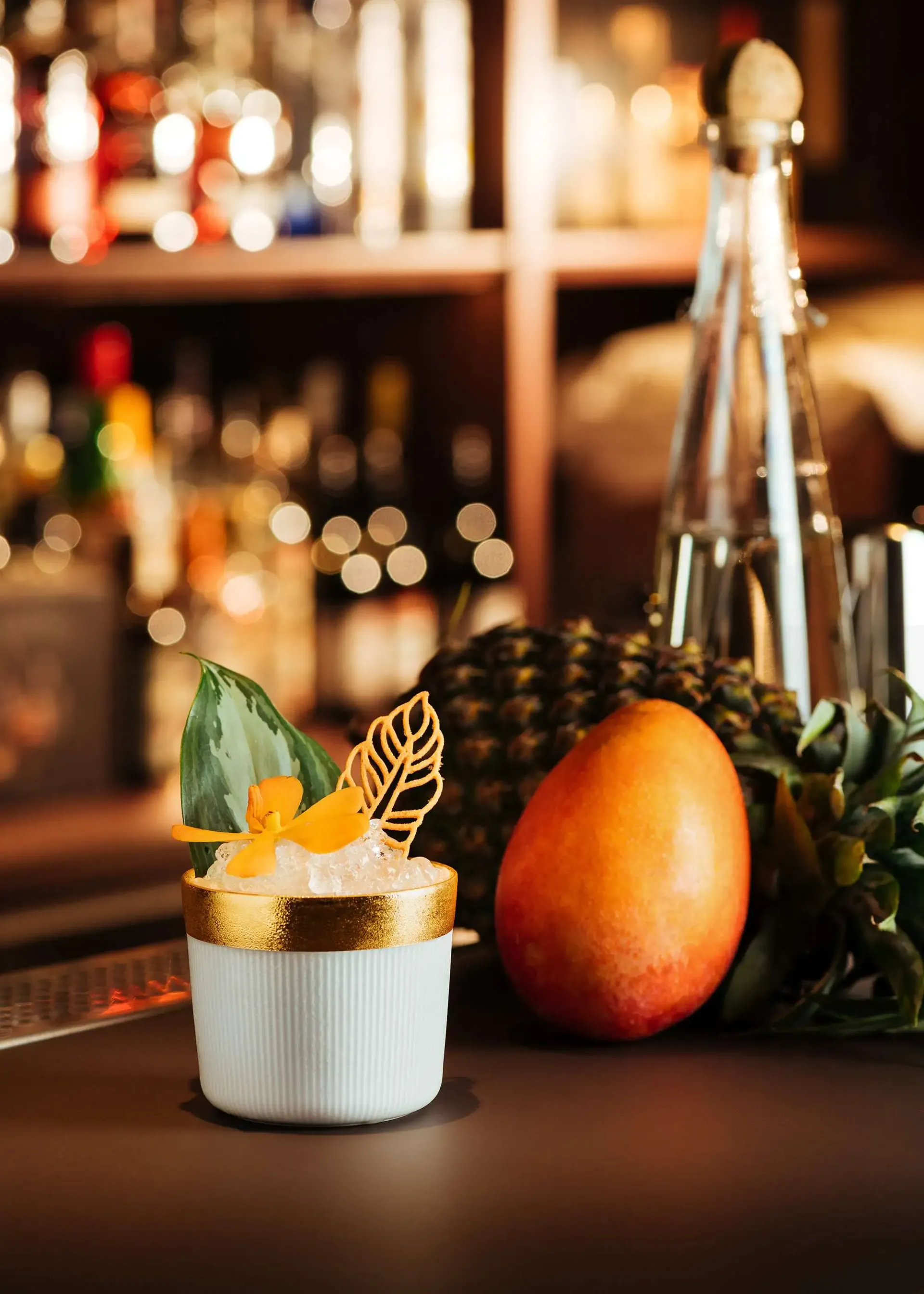 以蘭姆酒、椰漿、鳳梨汁為基底,洋溢明亮加勒比海氣息的Pina Colada,甜酸的風韻極度討喜外,Daniel也特別加入台灣夏季盛產的芒果與百香果、杏仁利口酒及闊葉造型脆餅,搭配新鮮椰仁色調的白色酒杯,堆疊熱帶風情的歡快。