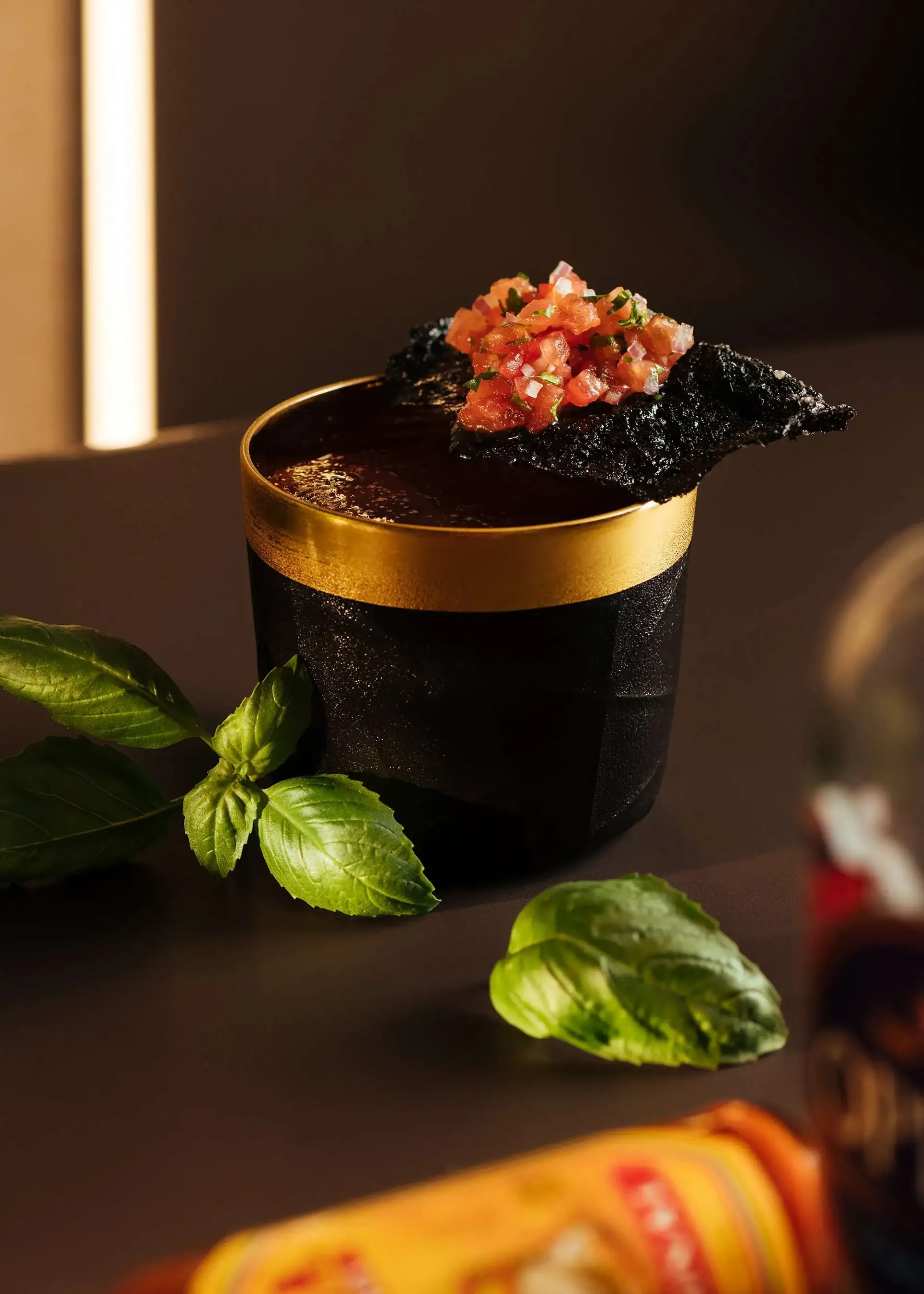 經典的Bloody Mary,由伏特加、番茄汁與辛香料為元素,製造出濃烈且鮮明的口感。黑色SIP OF GOLD香檳杯承接著酒款風味的獨特性,在調酒師點睛加入帶有孜然風味的大象琴酒、香氣極度濃縮的澄清番茄汁下,推升出經典酒款的新高度,Bar Food水準極高的Impromptu也將風乾墨魚、柴魚粉、莎莎醬、櫻桃番茄、墨西哥Cholula辣醬等食材、調料加入酒款提味點綴,苦辣鹹嗆味蕾一次撞擊爆發。
