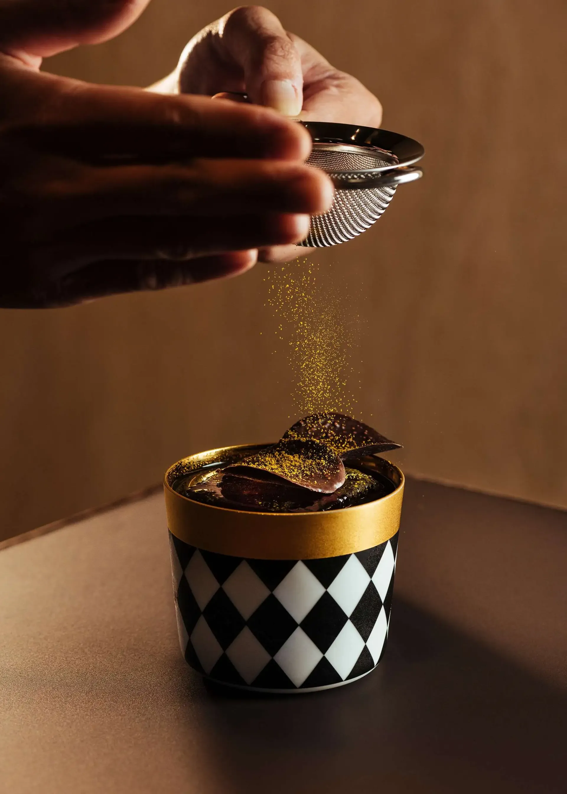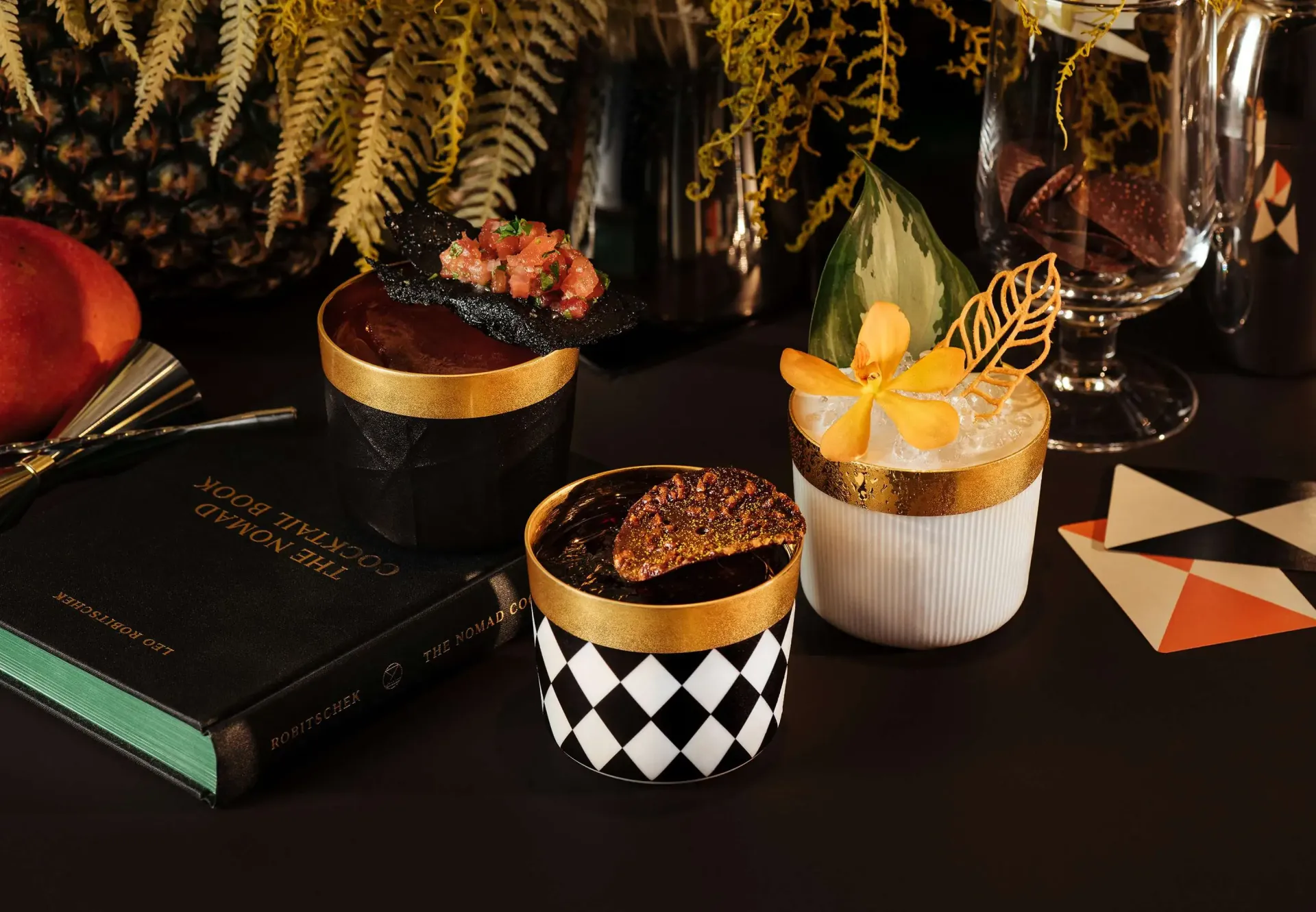 名稱就非常引人遐思的Boulevardier,是一款見證時代的經典威士忌調酒,它和Negroni源於同一家族酒譜,也是享受醇厚酒感與苦韻的風格之選。擅長風味重組的Daniel以藥草酒取代傳統配方的苦精,不但豐富草本的層次,平衡木質調濃重,搭配紳士穿搭般的黑白格紋酒杯,更襯托琥珀陳釀的神秘魅力。